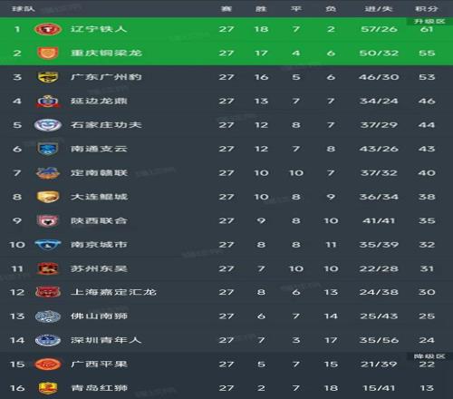 北京时间10月20日,中甲第27轮已经结束了所有的比赛,最新积分榜如下!