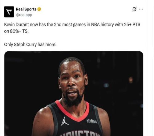 此役,杜兰特还创下了NBA历史第2神迹。数据显示,这是杜兰特生涯第69次单场砍下25+且真实命中率超过80%,与詹姆斯哈登并列历史第二,仅次于斯蒂芬库里(102场)!