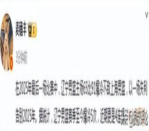 媒体人“三土带刺”发文点评:“2025年的最后一天,辽篮主场65-91输给上海,2013年12月之后、12年来首次遭遇四连败。”