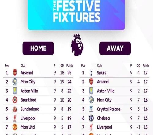 英超各队主客场战绩对比:阿森纳主场强势,热刺客场爆发